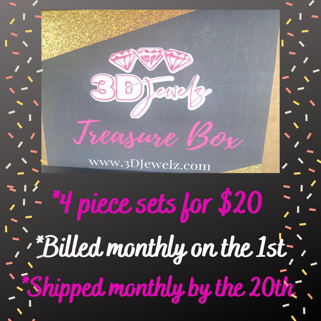 The 3D Jewelz Treasure Box is a monthly subscription box containing four (4) Paparazzi Accessories picked by 3D Jewelz to create a complete, coordinated look.