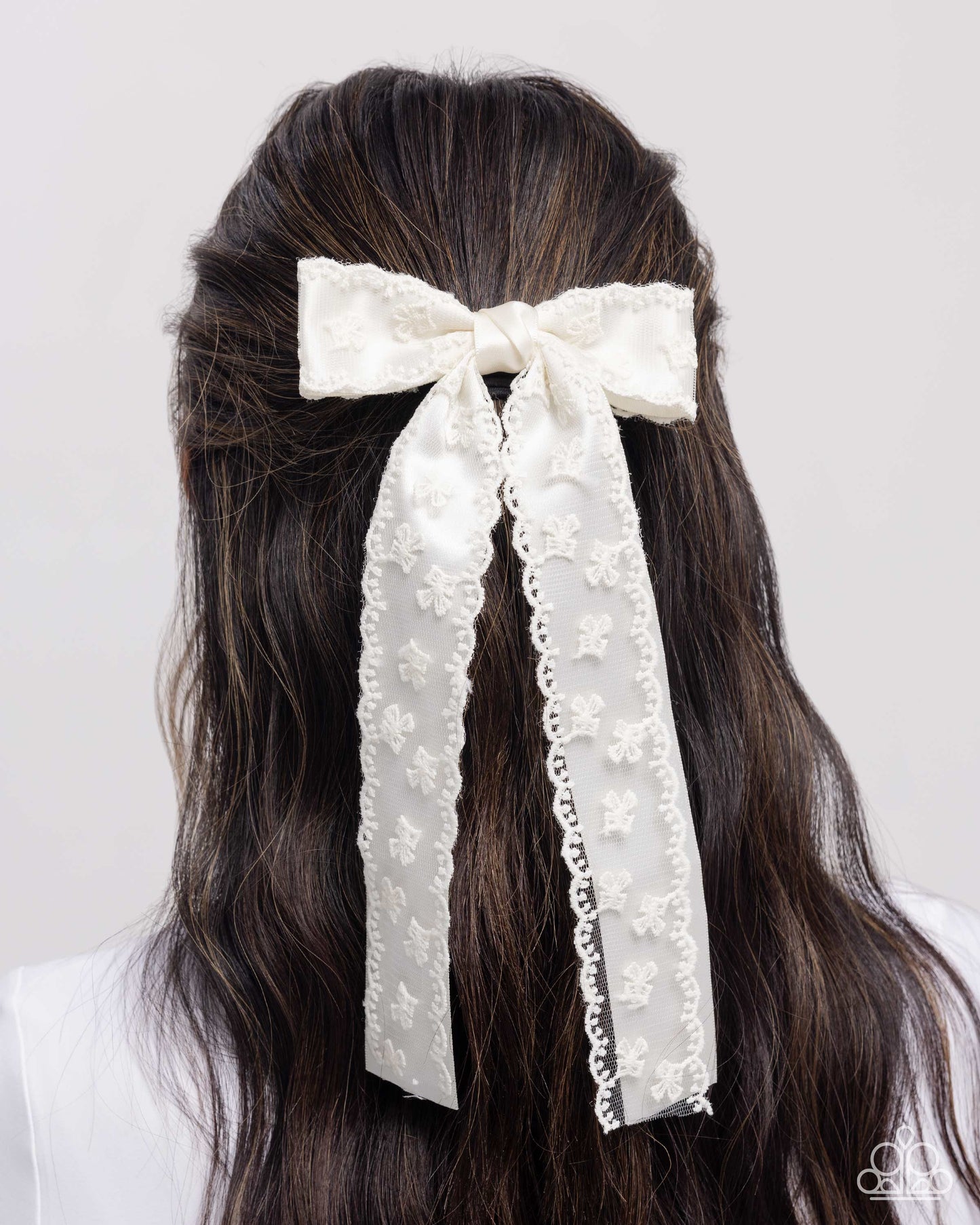 Featuring an ivory, bow-motif lacy overlay, an elongated ivory layered bow stands out. Features a standard hair clip on the back.