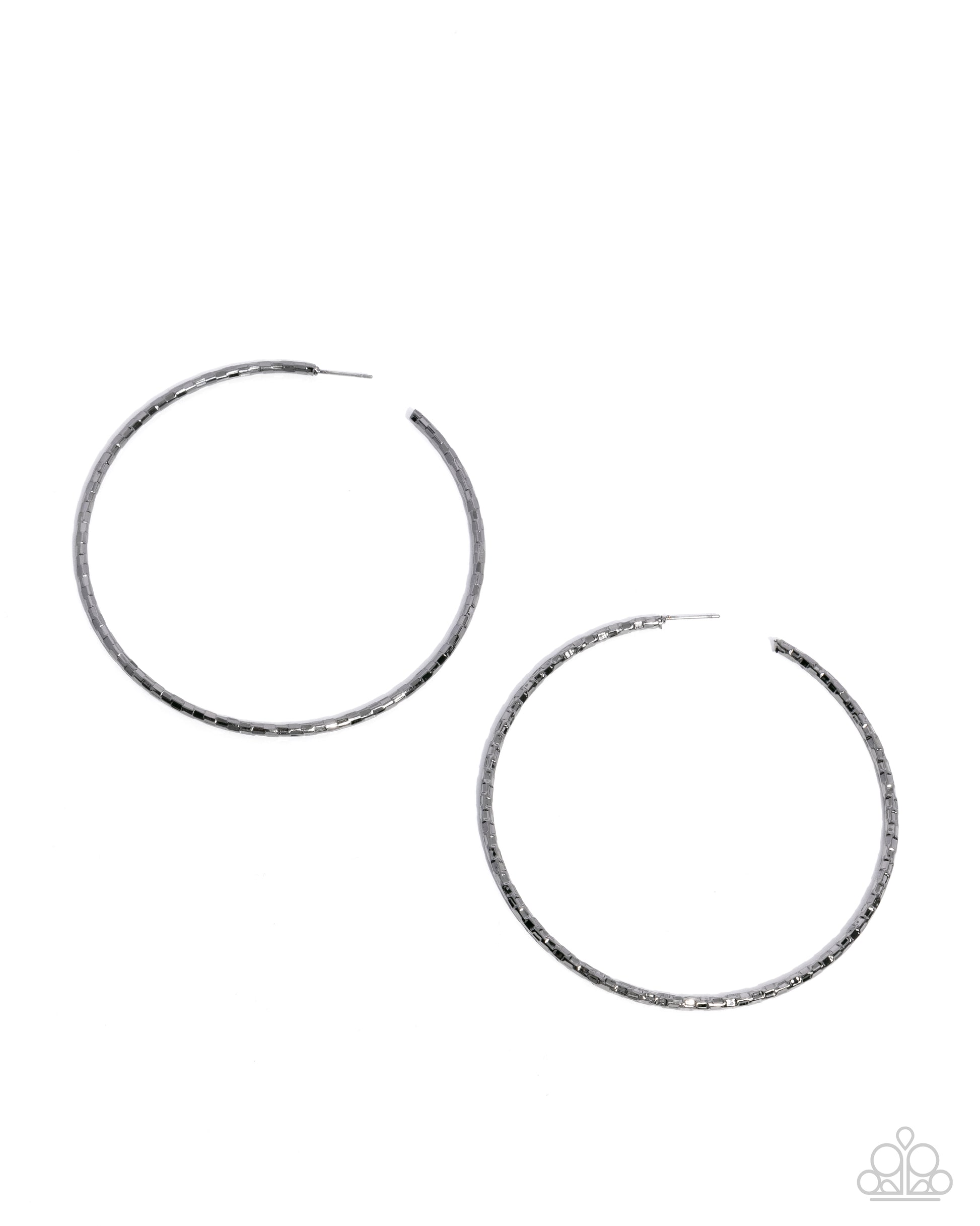 Infused along an invisible wire, a collection of gunmetal cylindrical beads with a subtle texture stack atop one another for a glistening, grungy look. Earring attaches to a standard post fitting. Hoop measures approximately 3" in diameter.