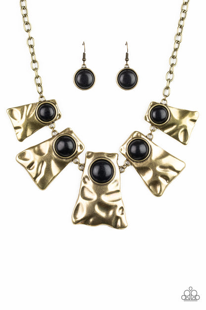 Rippling with hammered details, flared brass frames join below the collar, creating a fierce fringe. Refreshing black stones are pressed into the tops of the frames for a colorful finish. Features an adjustable clasp closure.