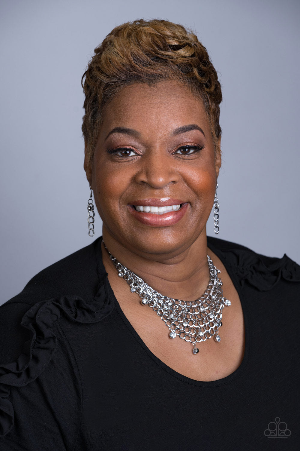 A collar of layered interlocking silver chain provides the canvas for gorgeous clear rhinestones to sway delicately. Features an adjustable clasp closure. All Paparazzi Accessories are lead free and nickel free!