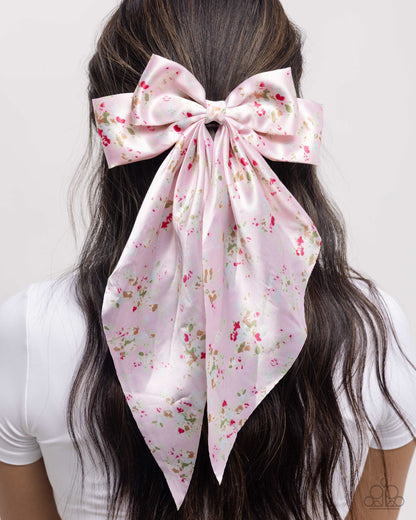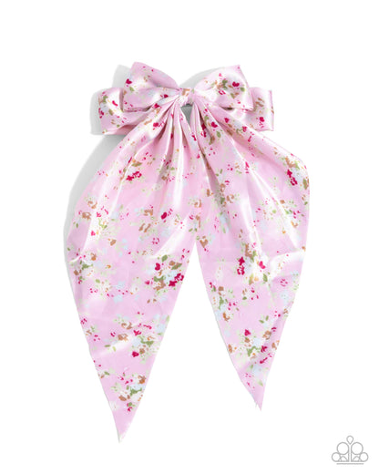 A delicate bow made from silky, pink fabric blooms with a subtle floral print in shades of pink, blue, and green. The oversized bow tails drape elegantly down the back of the hair, creating a romantic and whimsical design. Features a standard hair clip closure on the back.
