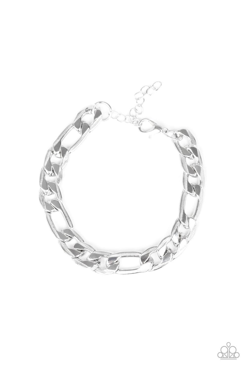 Etched in linear texture, a chunky silver figaro chain links around the wrist for a statement-making finish. Features an adjustable clasp closure. All Paparazzi Accessories are lead free and nickel free!