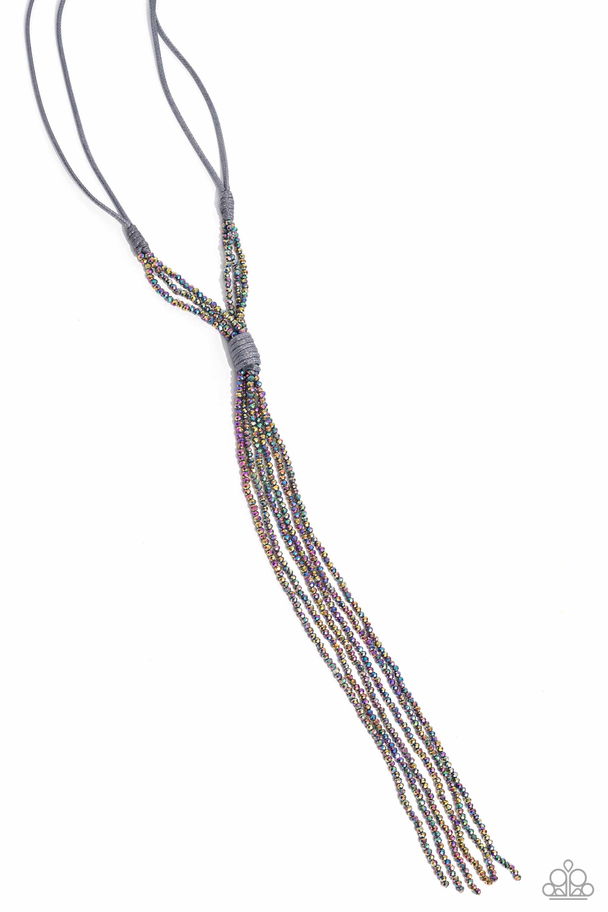 Cascading from a double strand of elongated gray cording, flashy faceted strands of oil spill beads are knotted in place as they shimmer and shine down the chest for a knockout statement. Features an adjustable clasp closure.