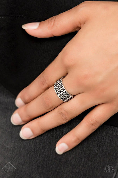 Three rows of shimmery silver chain links stack across the finger, coalescing into an edgy layered band. Features a stretchy band for a flexible fit.