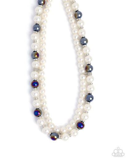 Two strands of polished white pearls in varying sizes, accented with oil spill-splashed metallic beads and silver discs, elegantly drape around the neck for a timeless design with a modern twist. Features an adjustable clasp closure.