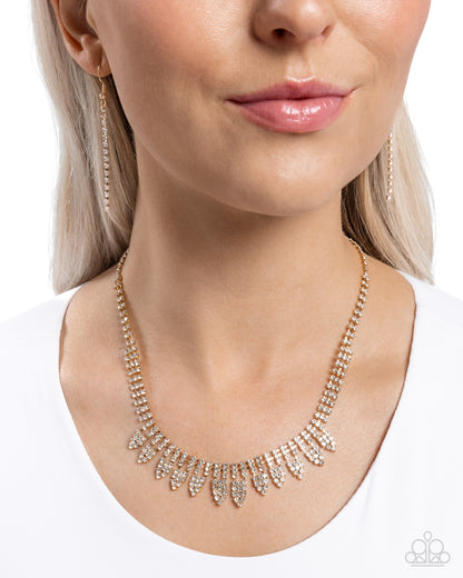 A single strand of dainty white rhinestones in gold square fittings leads down the neckline to a doubled strand of rhinestones in the same square fittings. A third row is added as the gems make their way to the centermost point of the design, creating a sparkling display. Spade-like frames embellished in dainty white rhinestones drip from the dazzling rows above, swinging down the chest in a ritzy finish. Features an adjustable clasp closure.