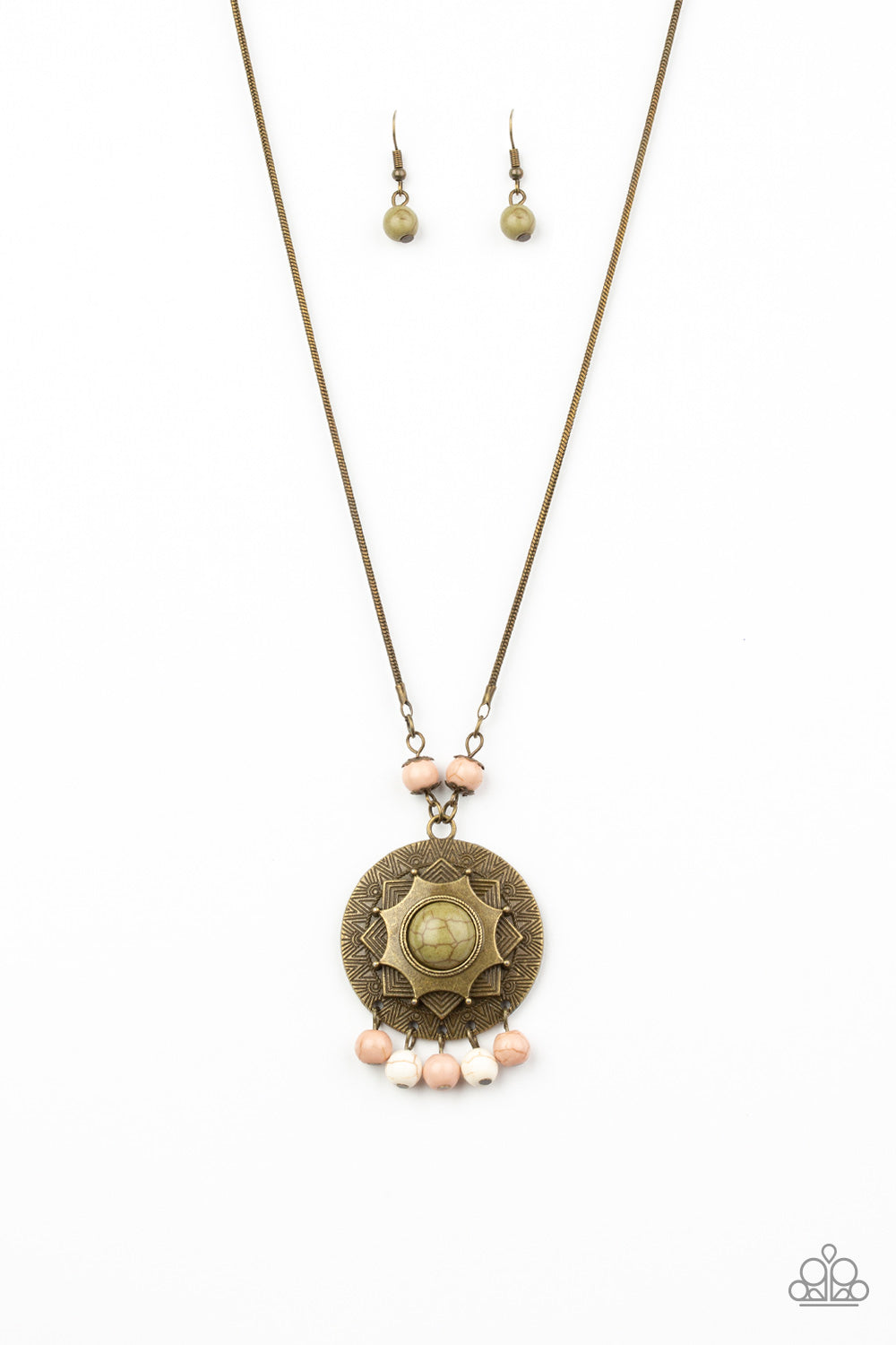 Dotted with an earthy green stone center, a stacked brass pendant gives way to a beaded white and brown stone fringe, creating a colorful tribal inspired pendant below the collar. Features an adjustable clasp closure. All Paparazzi Accessories are lead free and nickel free!