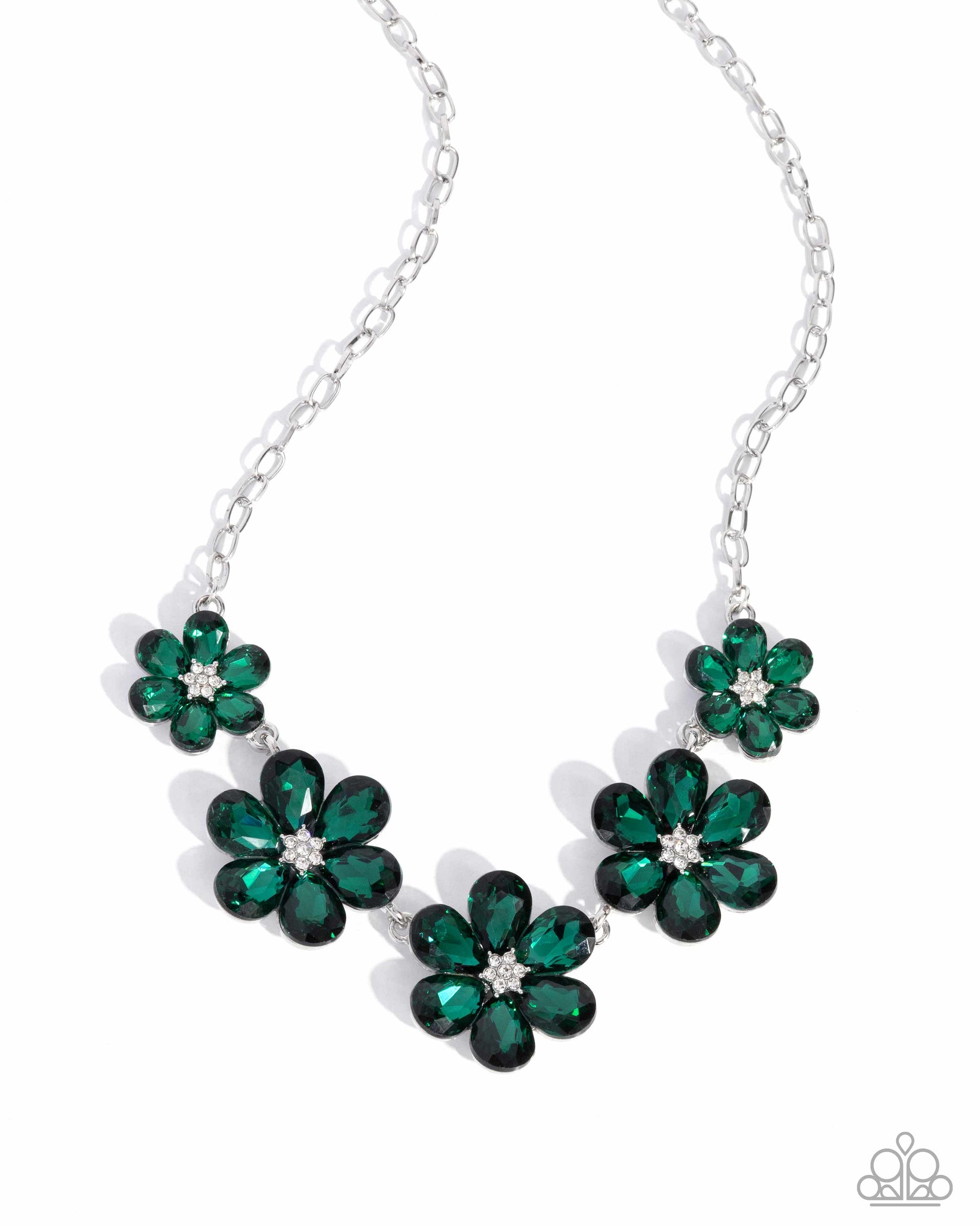 Dotted with dainty white rhinestone floral centers, a flirtatious assortment of crystal-like emerald gem flowers gradually increase in size as they link below the collar from a silver cable chain for a playful pop of color. Features an adjustable clasp closure.