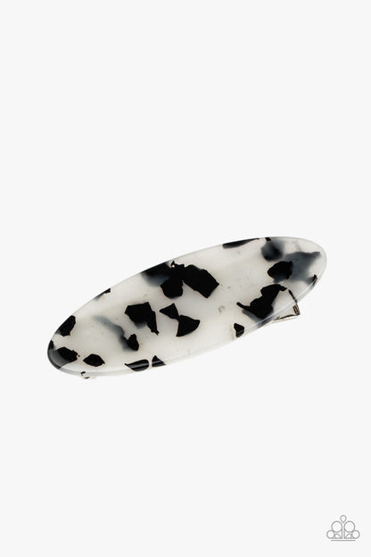 Featuring a white and black tortoise shell finish, an oval acrylic frame pulls back the hair for a retro look. Features a standard hair clip on the back.