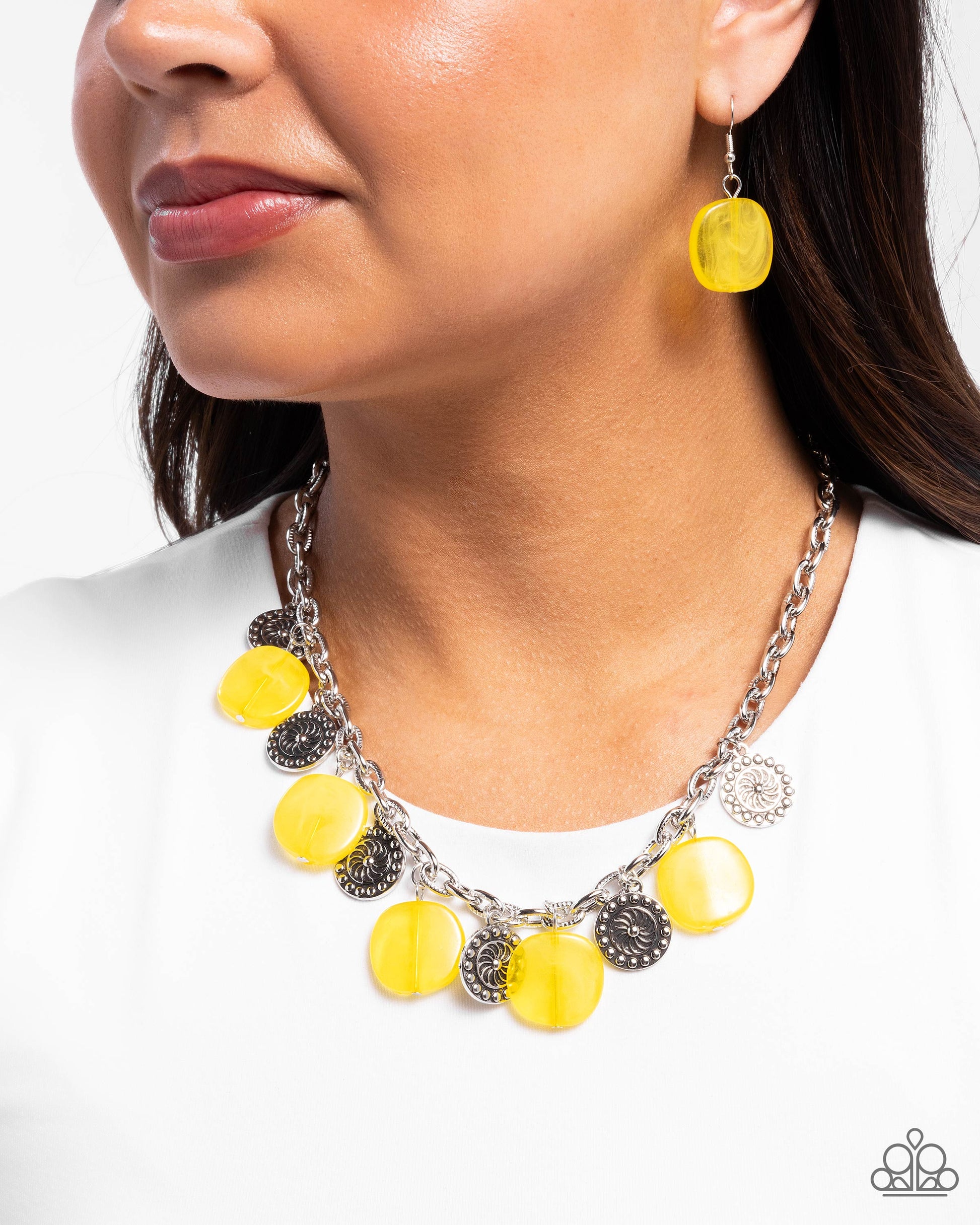Swaying along a textured silver cable chain, a collection of stud-embellished silver wheel discs alternate with yellow acrylic discs below the neckline for a chic display. Features an adjustable clasp closure.