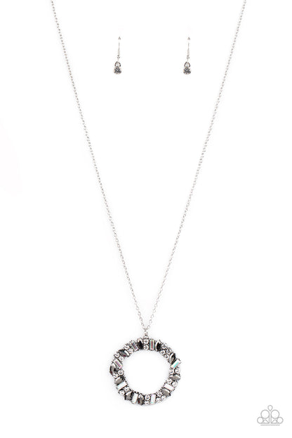 Marquise cut hematite rhinestones, classic white rhinestones, and iridescent emerald style rhinestones are encrusted along the front of a circular frame, creating an elegant wreath at the bottom of a lengthened silver chain. Features an adjustable clasp closure.